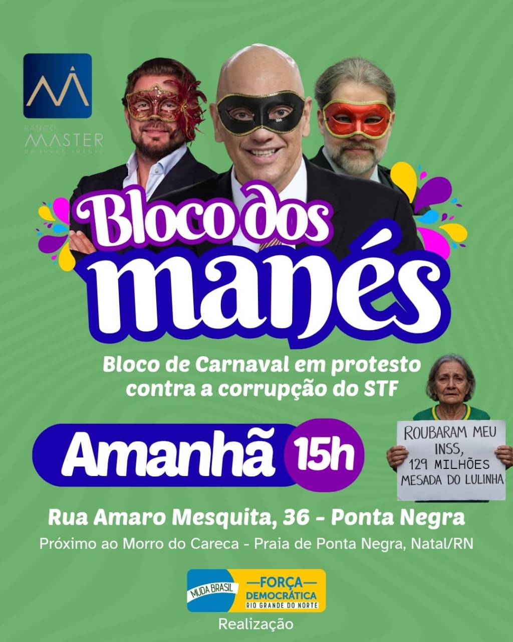 Nenhum corrupto será esquecido. Vamos às ruas com alegria, irreverência e consciência, mostrando que o povo sabe se manifestar com energia e determinação no Bloco dos Manés!